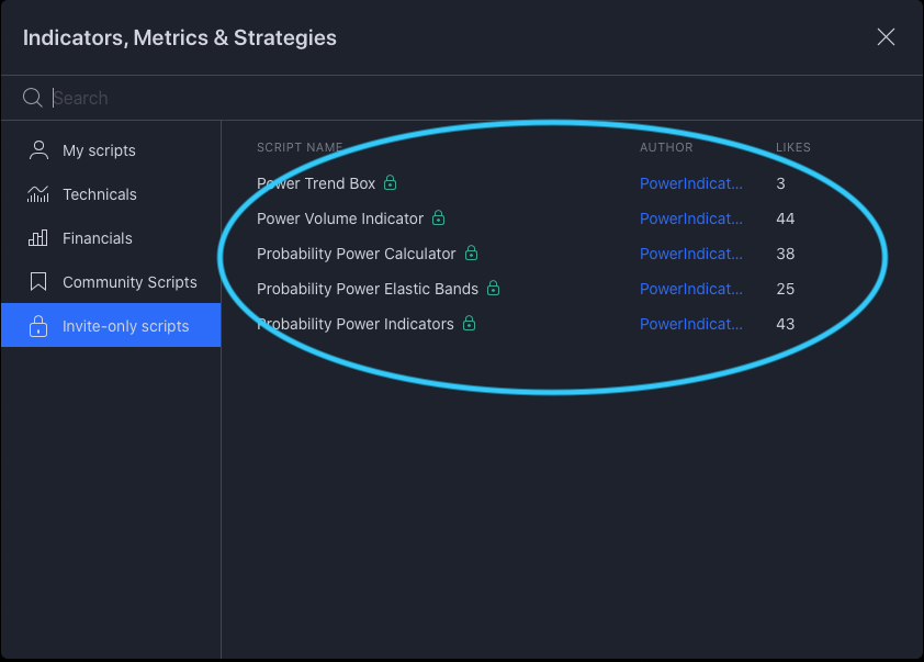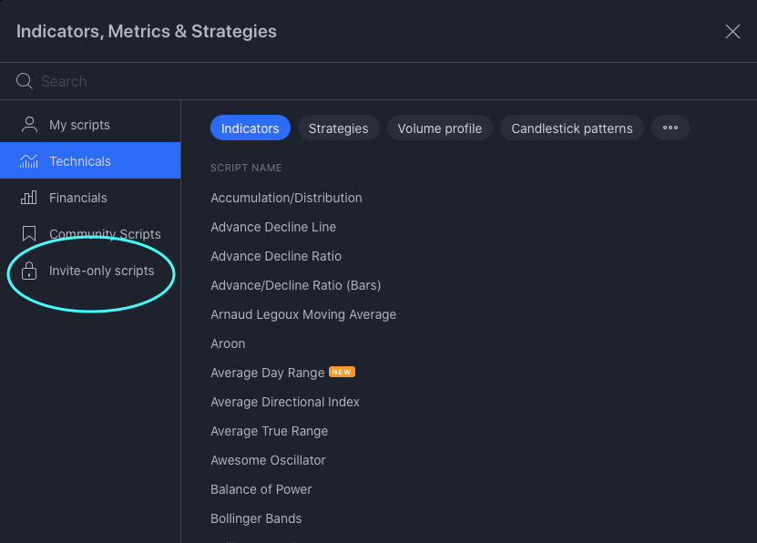 Selecting the invite-only pane in the indicator selection dialog to access the scripts
