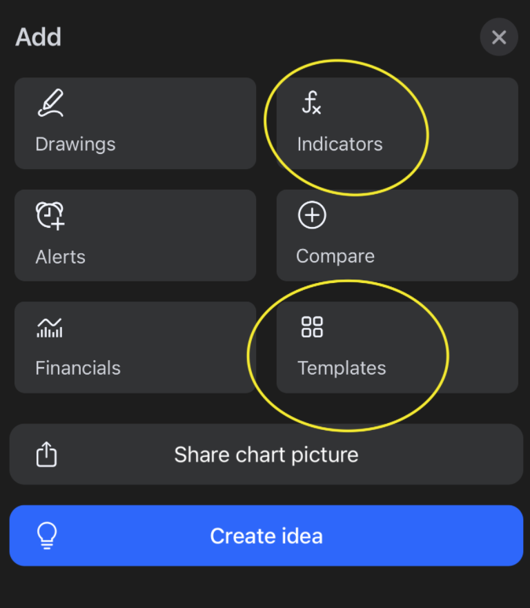 On the iPhone and iPad, you gain access to the indicators and indicator templates buttons by pressing the circled ‘Plus’ button