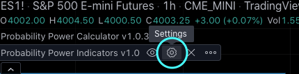 All the Probability Power Indicators have optional settings – some more than others. The individual indicators settings are discussed on the individual indicator sections. You can access the indicators settings by clicking on the “gear” icon to the right of the indicator title or via the 3 dot menu on the same line and selecting the “settings” menu item.