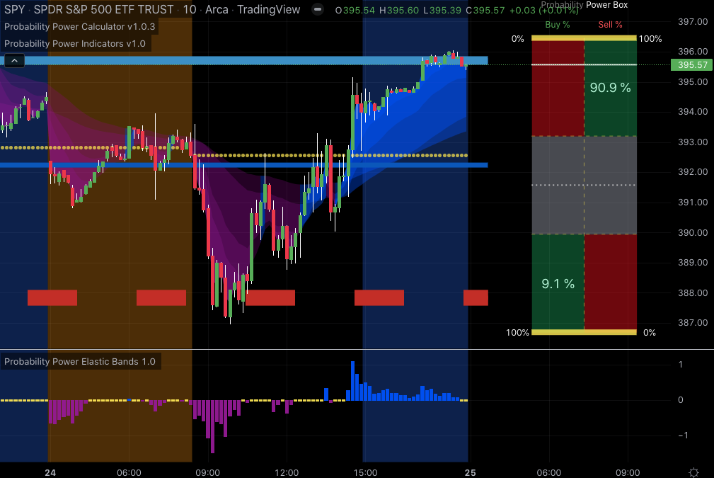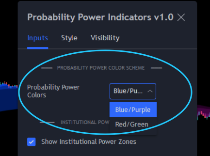 Probability Power Indicators offers two distinct color schemes from which the user can choose – a futuristic Blue/Purple combination, and the traditional Green/Red.