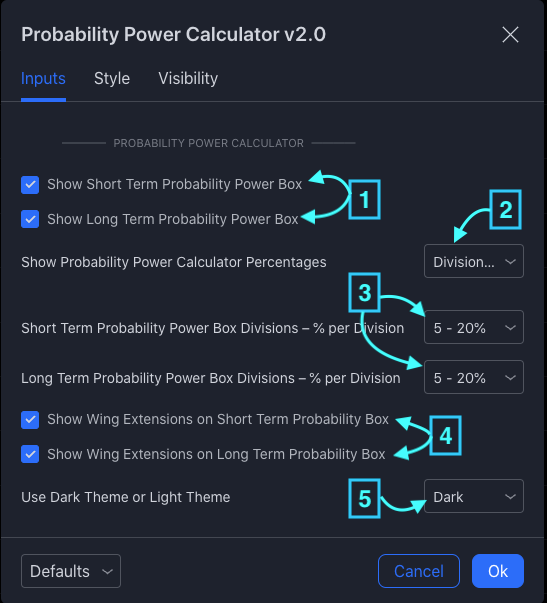 Setting (4) determines if the Probability Power Calculator should be drawn with appropriate colors for Trading View’s Dark Theme or the Light Theme. The default is to use the Dark colors.
