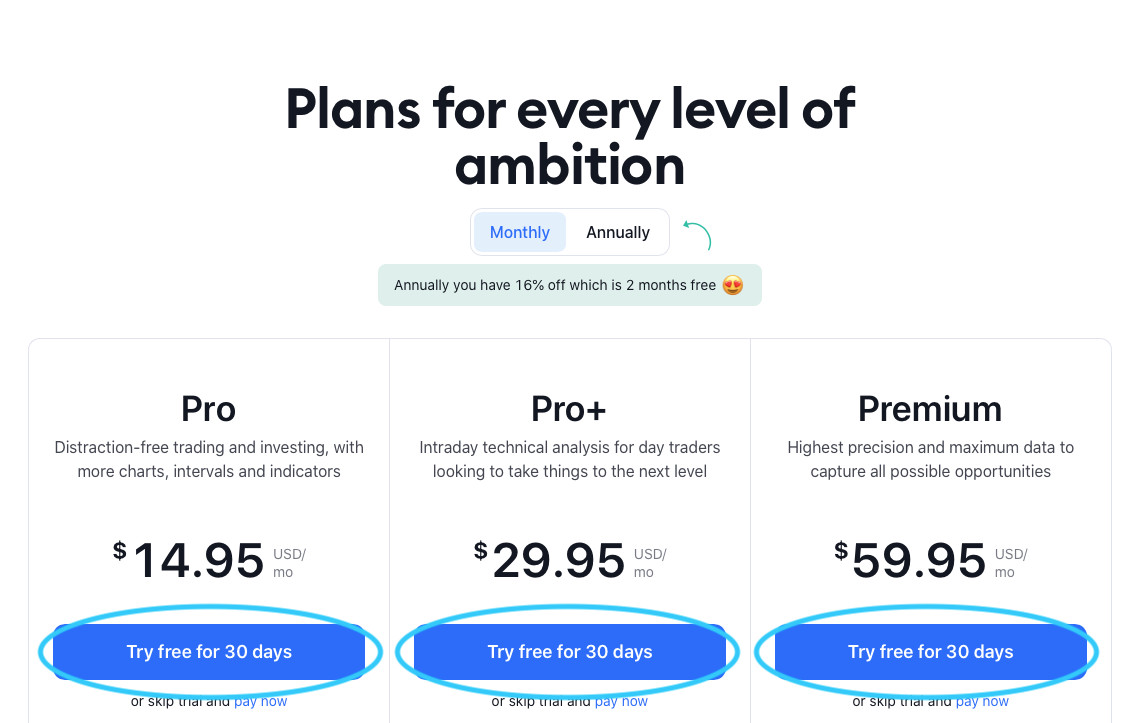 Picture of Trading View Home Screen – where to sign up for trial accountOn the next page, choose one of the subscription levels and click the ‘Try free for 30 days’ button. #